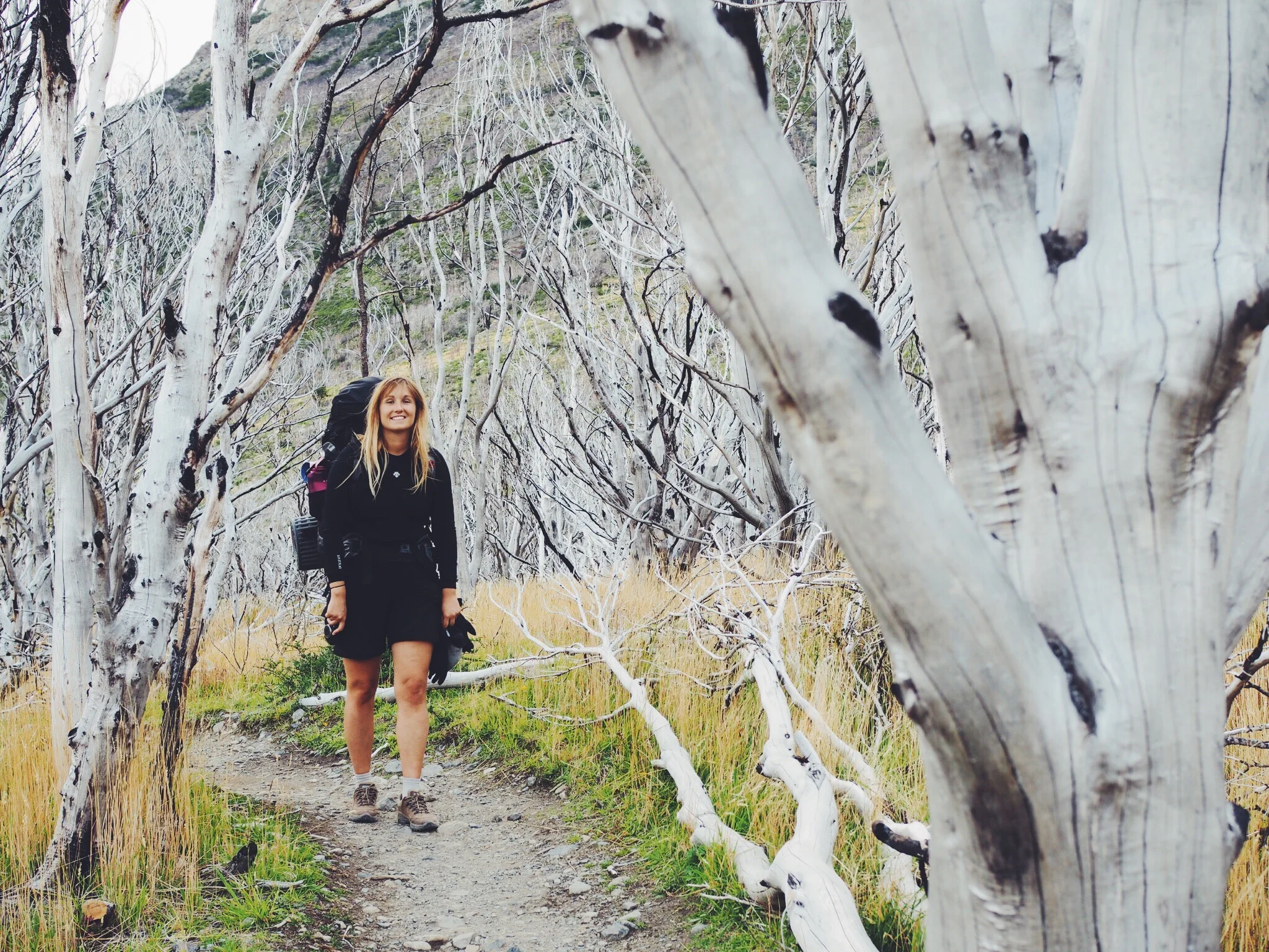 The following morning we made porridge and tea before packing up our tent and setting off on our next stint to Campsite Italiano. As we were walking back on ourselves the scenery was fairly uninteresting until we passed our starting point where the Catamaran dropped us. We wandered through scorched black and white trees where a fire had torn through the park a few years before (you can read up on it here). After a quick lunch of our own chorizo quesadillas (highly recommended) the clouds cleared in front of us to reveal Los Cuernos del Paine, an epic group of jagged pewter-coloured mountains.