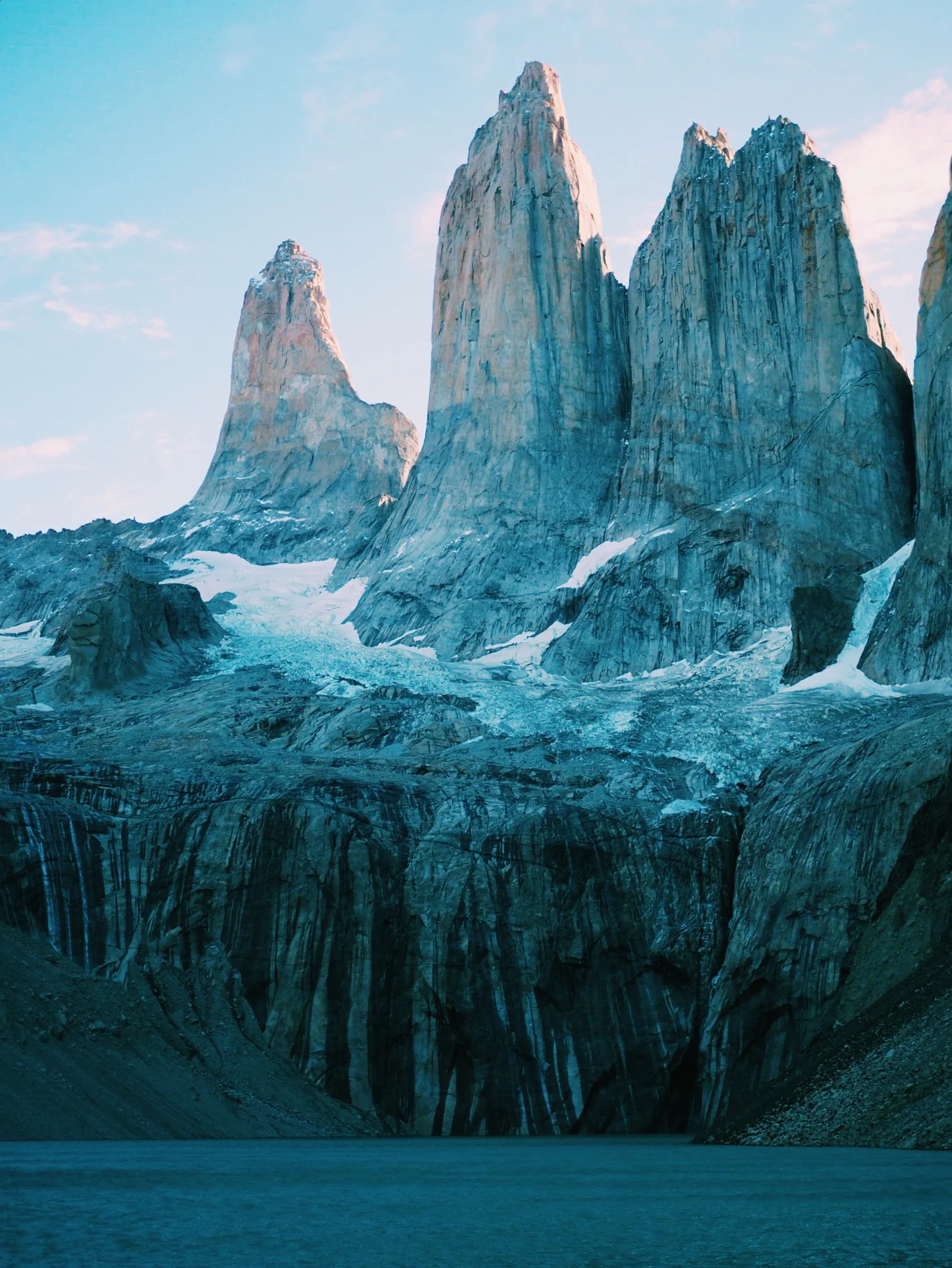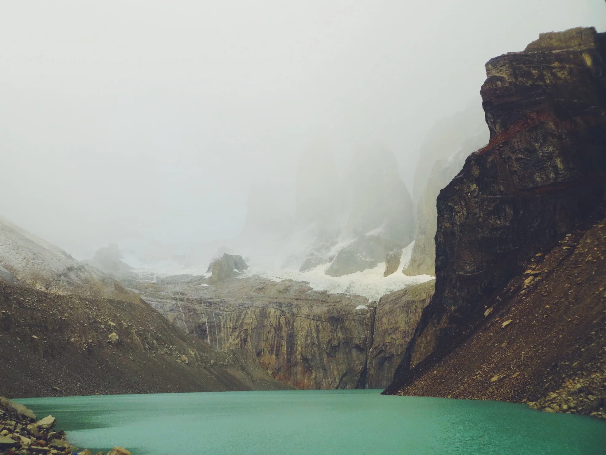 When doing the W trek west to east, on the final day its tradition to get up in the early hours and see Torres at sunrise. At 5am we begrudgingly woke up, packed a sleeping bag and warm clothes and set off in the dark to Mirador Torres once again, eager to witness the classic sunrise. Using head torches, we followed the small reflective arrows up the steep rocky path in the rain, not really sure why we were putting ourselves through it again! Towards the top it started to snow, but we powered on determined to make it before the sun came up. Sadly we arrived in thick fog, and could barely see the mountains at all. Although this was disappointing, it made us feel even more glad that we’d gone up the day before.