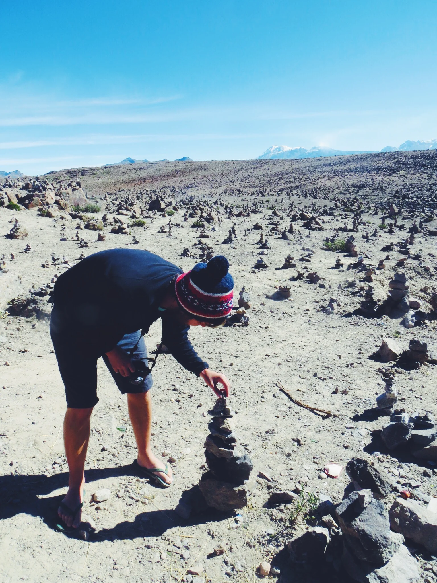 Once finished we were then back in the mini bus and headed up towards our next look out of the nearby volcanoes. The air temperature was really cold as we had reached an altitude of 3,650 meters, and so we only spent a few minutes there to get some pictures, but it was great to see the smoking Volcan Hualca in the distance and the hundreds of small rock piles that had been carefully balanced. We then headed a little further to a Llama park where wild Llama and Guanaco were roaming in the green and yellow fields.