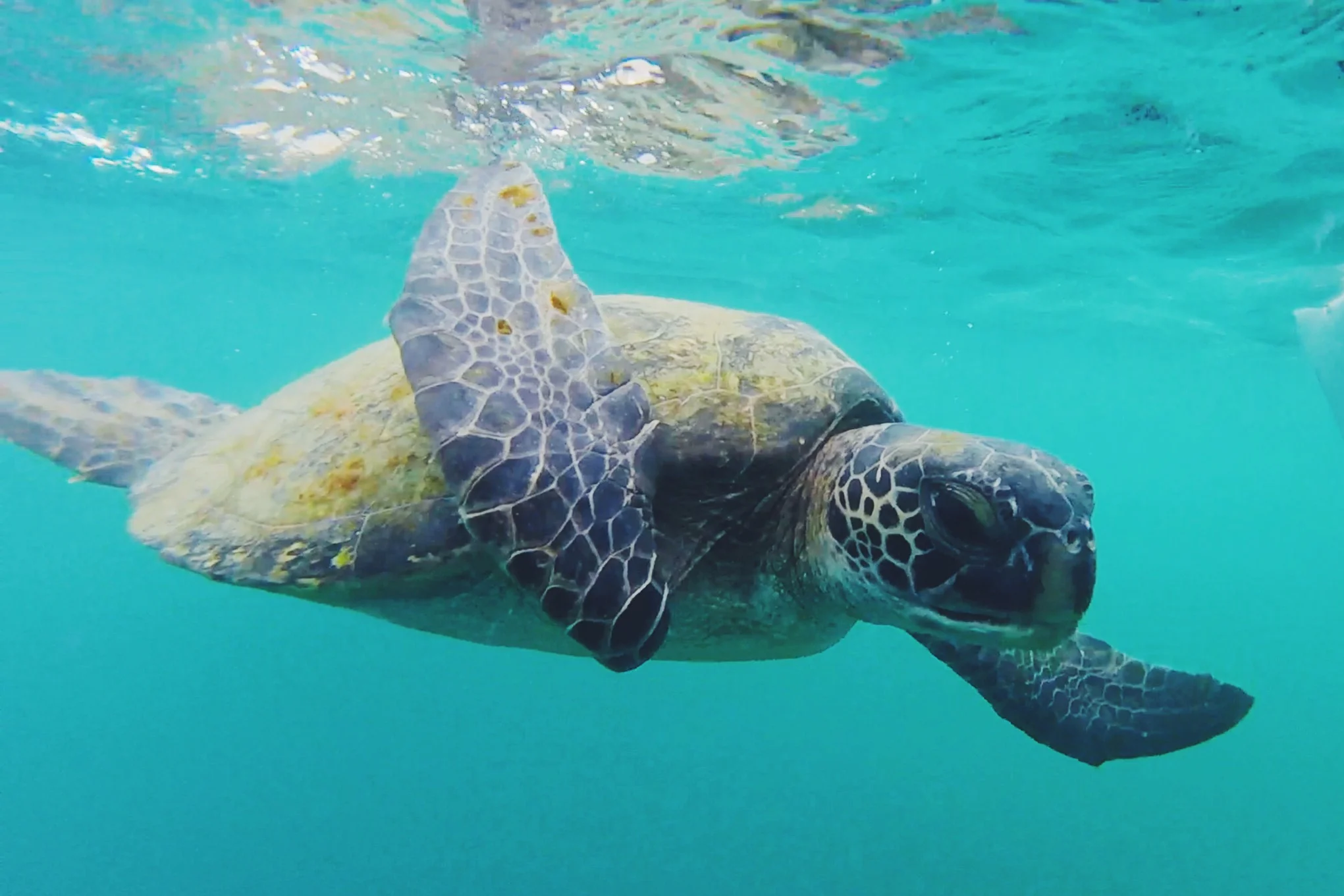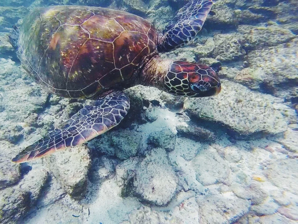 After walking back to the boat we were told we had some snorkelling time, and so we headed a little way up the coast to a spot which we were told had beautiful corals. Unfortunately once we entered the water we realised the visibility was really poor, and so found it hard to spot anything in the silt-filled water. We did managed to spot a sea turtle, a small Ray and some tropical fish, although most of the footage wasn't clear enough to make out. We then got back into the boat and had a quick sandwich and banana before making our way back.