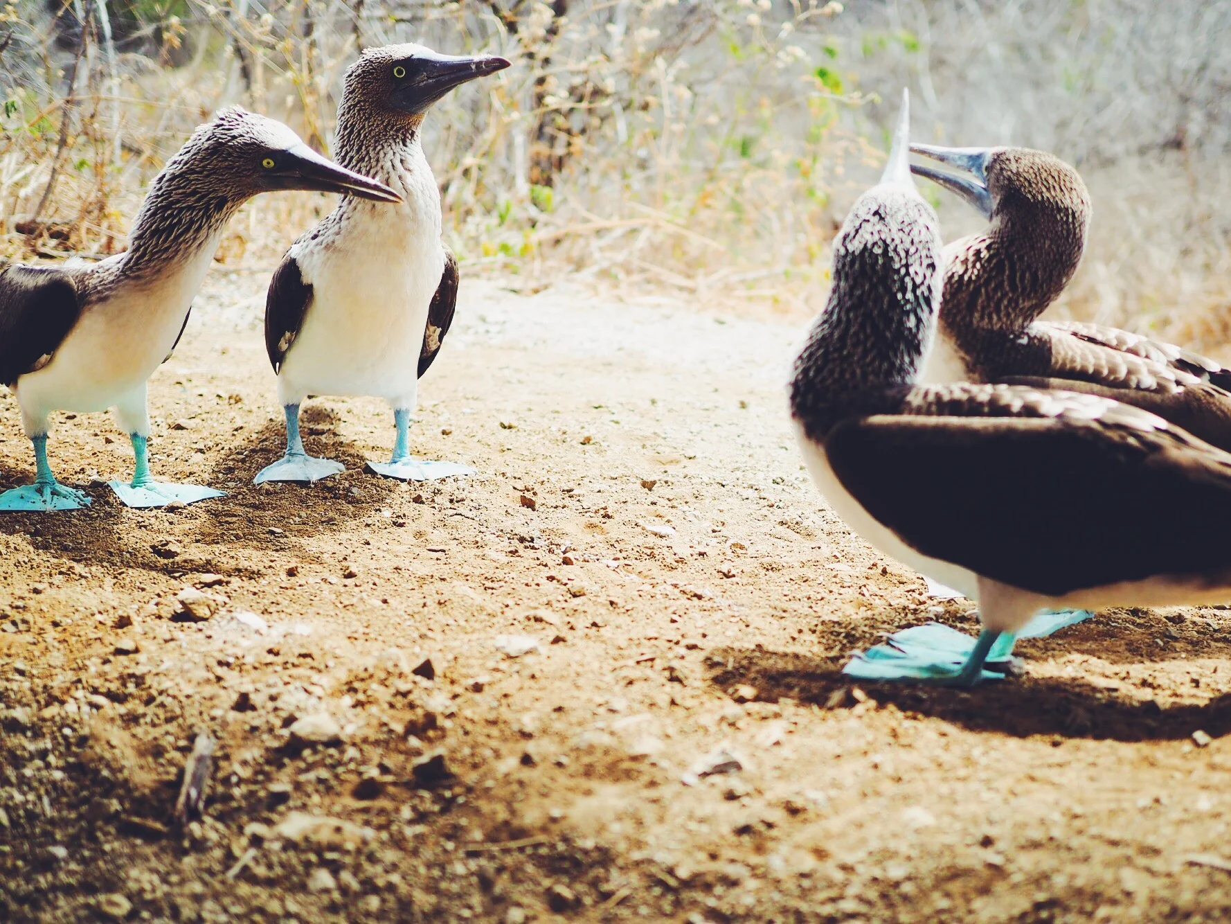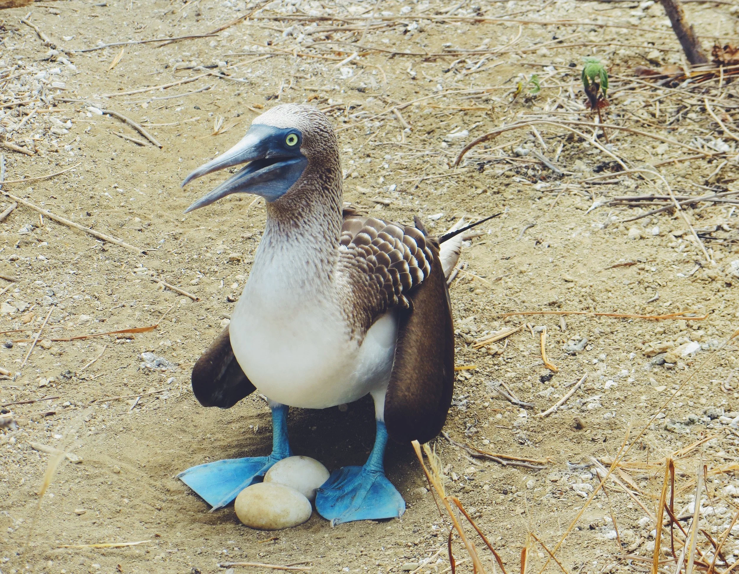 We arrived on the Island around 11am, and were organised into 2 separate groups. After a bit of waiting around our guide led us up the path to the top of the hill, and began to explain about dry climate and conditions on the island, and how it affected the vegetation and wildlife. Once we got to the top we spotted a series of nests belonging to the Blue Footed Booby, birds we had seen a lot of on the Galápagos. The novelty of their brightly coloured feet still hadn't worn off for us, and we enjoyed watching each couple perform their typical mating dance accompanied by whistles and squarks.