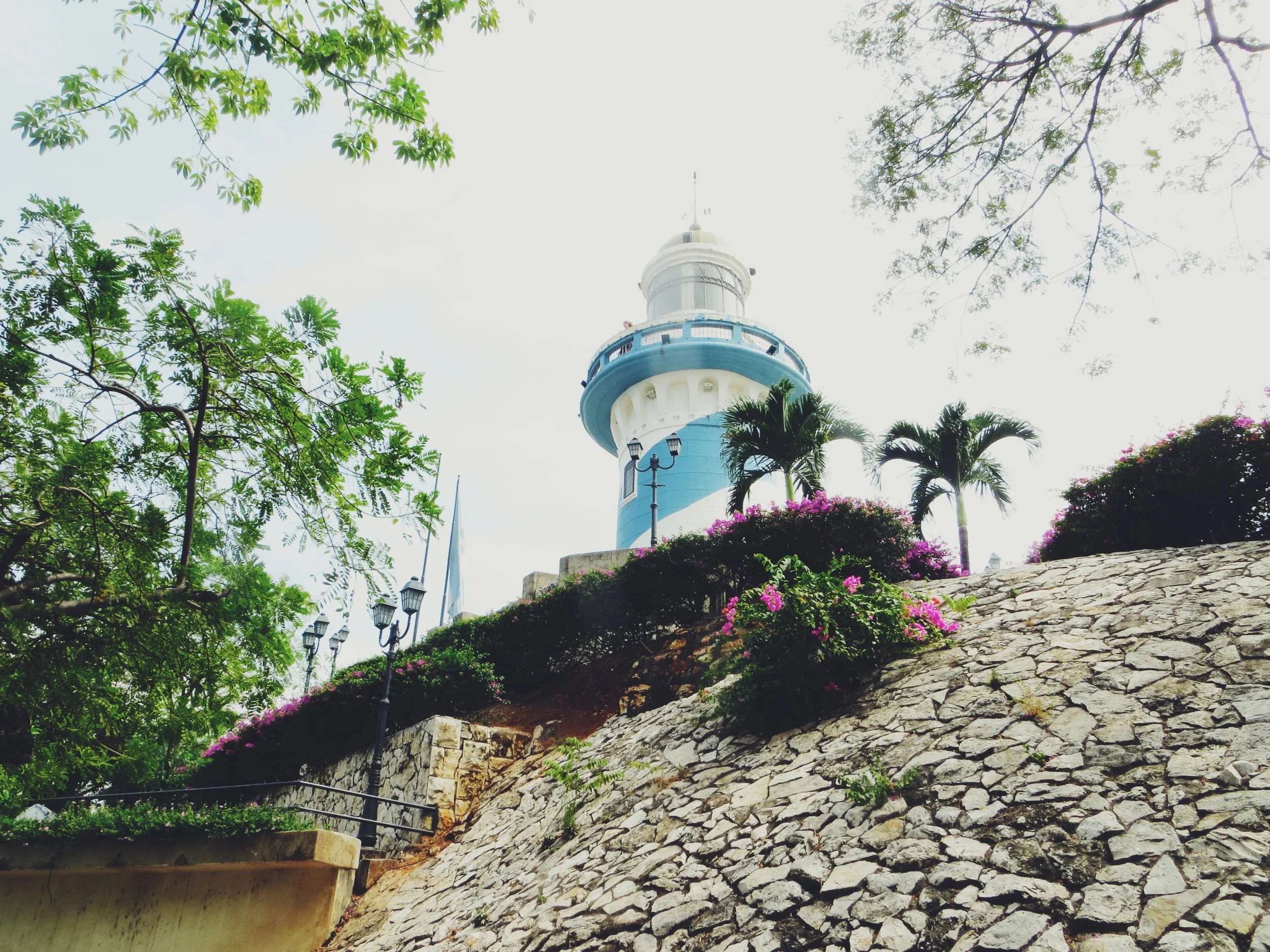 We then wandered through the city centre towards the waterfront of the Rio Guayas, and headed towards Las Penas, the colourful, artistic district of the city. To get there we wandered along the river front passing through various parks with water features and tropical plants. Once we arrived we headed up the steep roads past brightly painted walls, rustic doors and shutters (and many armed guards!) until we reached the lighthouse at the top of Cerro Santa Ana. At the top we started chatting to two local guys from the city called Juan and Julio, who were really friendly and kindly offered to give us a short tour of a few key spots around the city centre.