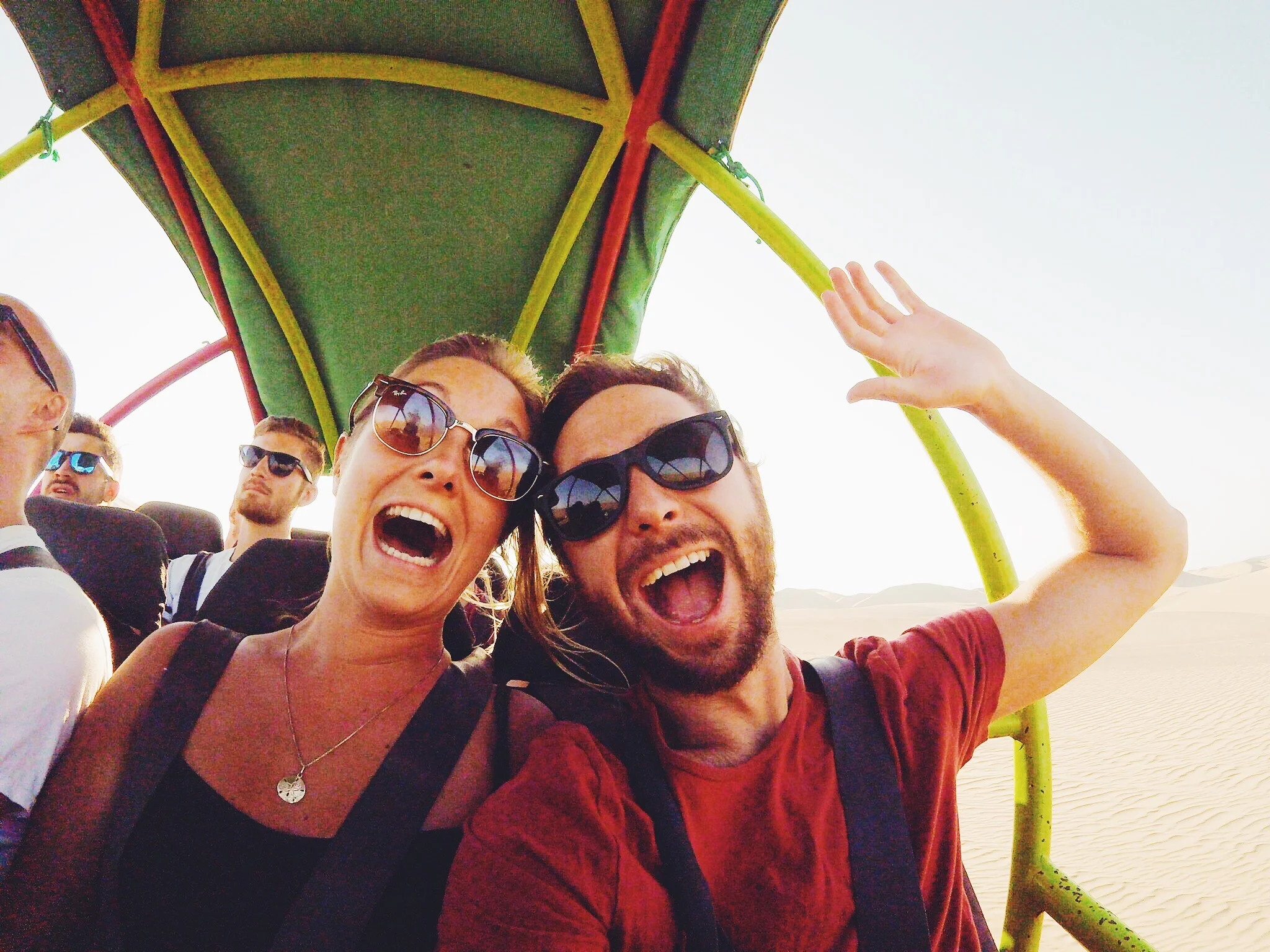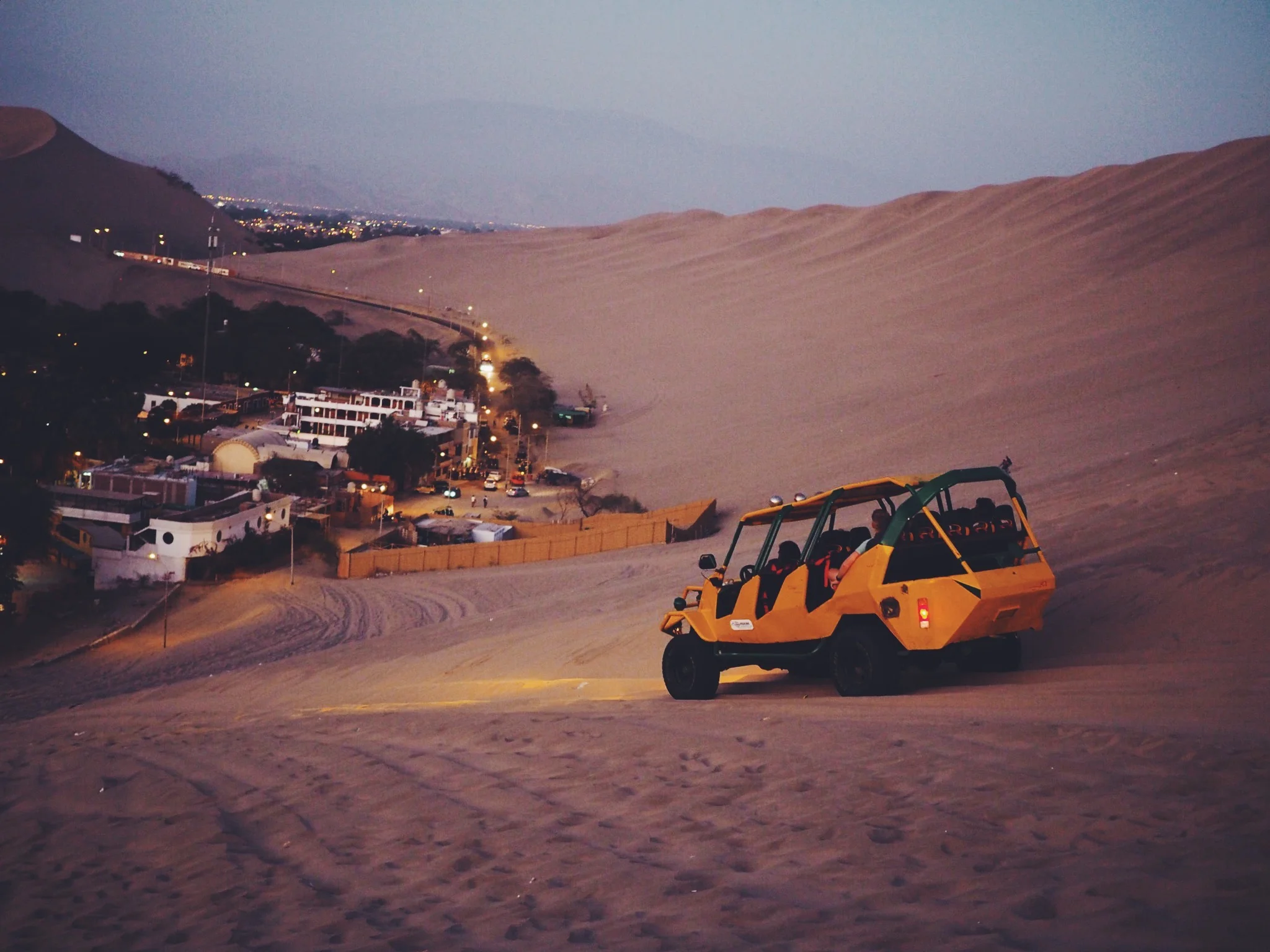 Once we had complete all 3 dunes we got back into the buggy and made our way through more gentle sandy mountains with the sun setting in the distance. We parked up with a load of other buggies to see the sunset view of Huacachina and the lake from above, with the city lights of Ica in the distance. We found the town looked much more appealing from above, and with the surrounding scenery and setting sun, it was a picturesque way to end the tour. As it got dark we slowly convoyed back to the town and to our hostel, feeling very sandy but also very satisfied with the days activities.